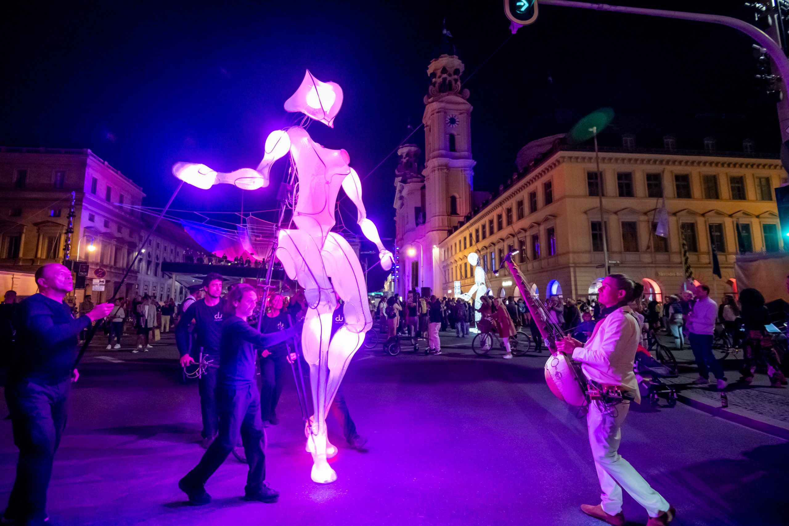 An impressive, floating dance set to glassy, digital music, it creates a breathless sense of wonder in the dark auditorium or on the stage, at the edge of the forest, on the beach, or in the nighttime square. It heralds the new and the strange, opening the space for a special evening’s program, an evening full of color and lightness.
